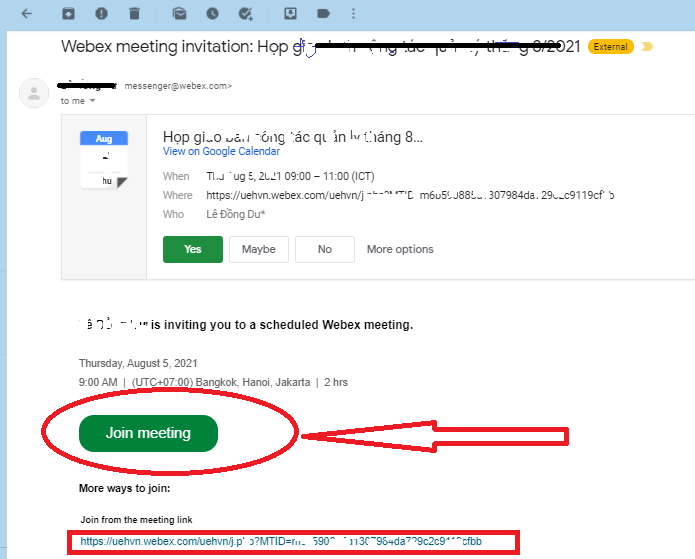 Bước 2. Nhấp chọn vào đường link (được gửi bởi Viện đào tạo Sau đại học), nếu máy tính hoặc điện thoại đã cài đặt webex thì click chọn Open Webex để mở chương trình (như hình)